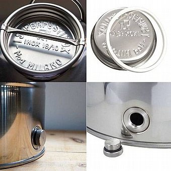מיכל נירוסטה איכותי בנפח 10 ליטר, כולל ברז ניקוז תחתון, מיועד לאחסון, שינוע ומזיגה נוחה של שמן זית, מים ונוזלים שונים. מתאים לשימוש ביתי וגם לשימוש מקצועי ותעשייתי.